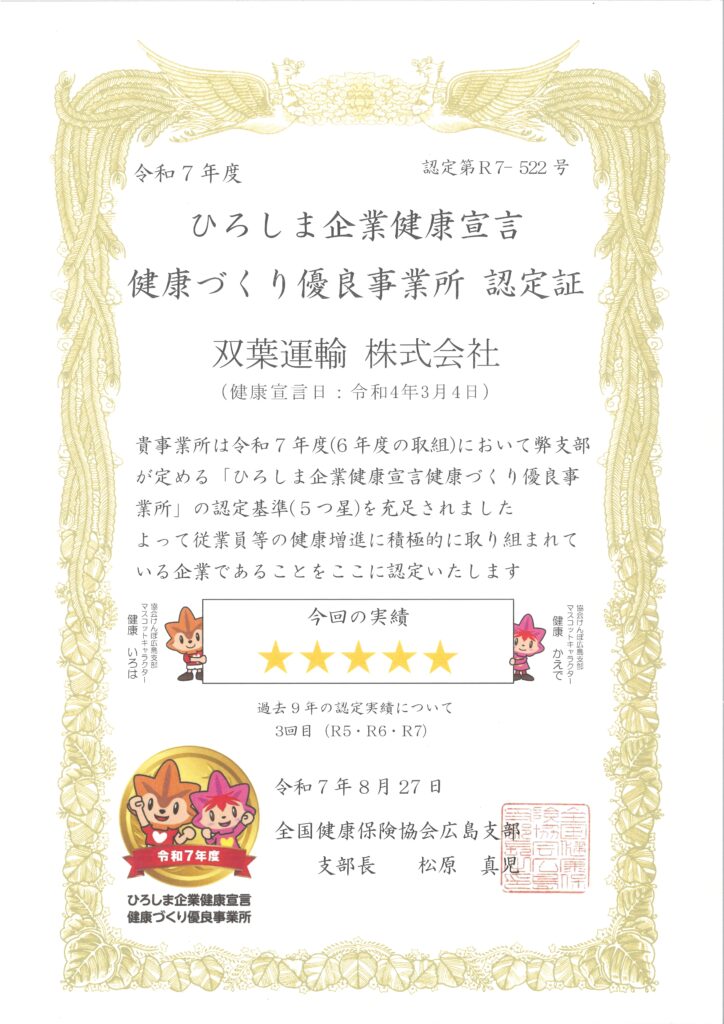 双葉運輸グループは、従業員等の健康増進に積極的に取り組んでいる企業として最高認定基準5つ星として、3回目の認定を受けました。